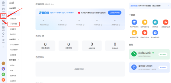 首先我们打开千牛工作台客户端后,在工作台操作界面的左侧导航栏中找到“店铺”选项,点击后我们在右侧就可以看到“店铺管理”的相关设置按钮了,我们在这一列选择“子账号管理”。