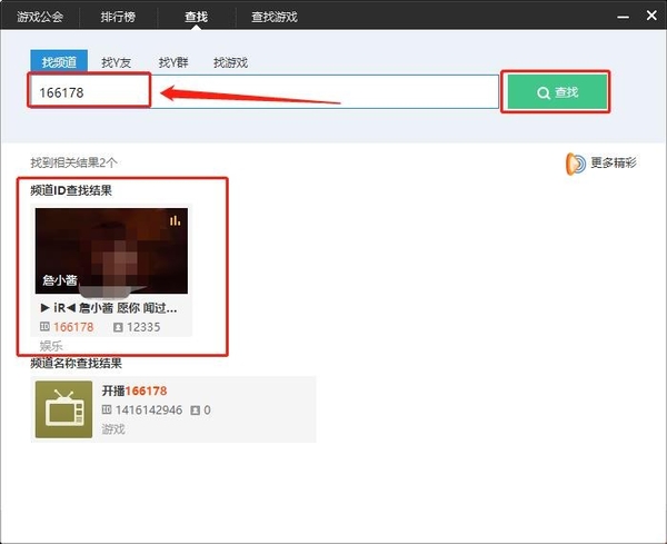 首先,我们进入到yy语音的主界面,在右下角有一个放大镜样式的“搜索”图标,我们点开“搜索”,在里面输入我们想看的主播的频道ID,点击后面绿色的“查找”按钮后,就可以找到该主播的直播间了。