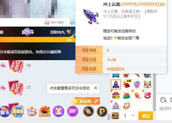 2、如果想给自己喜欢的主播送礼物,可以在右下方的礼物栏中挑选赠送。其中,包裹一栏中的是通过经验值升级等途径获得的免费礼物,其他的礼物则是需要充值购买才可以送给主播的。