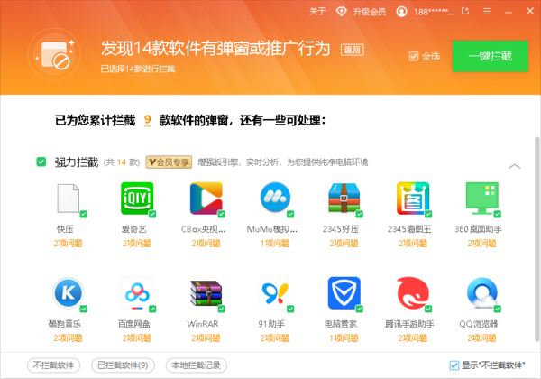 跳转到弹窗拦截页面之后,系统会自动对有广告弹窗的软件进行扫描,扫描结束后可以将所有选项全选上,再点击“一键拦截”按钮就能完成拦截了。不过需要注意的是,金山毒霸13的强力拦截功能,需要开通会员才能使用。