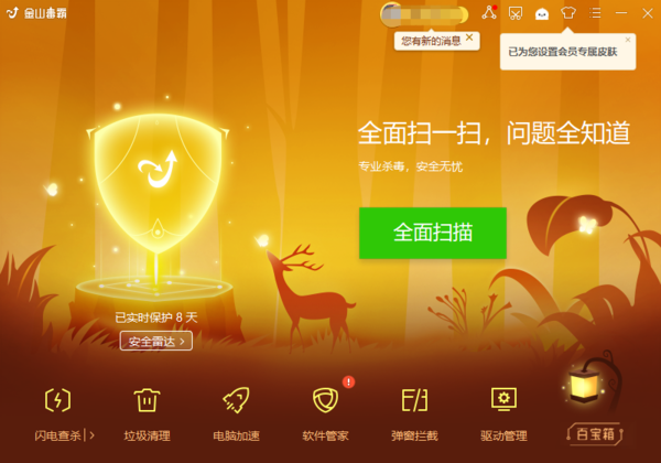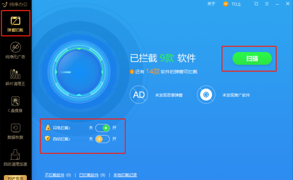 同样是在弹窗拦截界面,如果新下载安装了软件,可以点击页面中的“扫描”键,重新扫描软件添加拦截项。同时如果开通有金山毒霸的会员,建议可以开启“闪电拦截”和“自动拦截”,这样防护会比较全面,使用起来也会比较方便,不需要时不时手动操作。