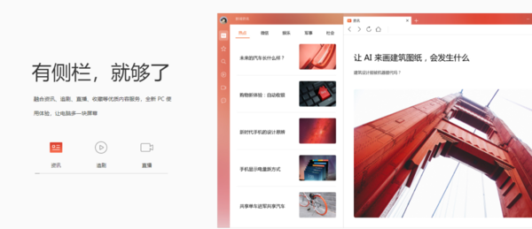 在最新版本的qq浏览器中,添加了侧栏导航功能,涵盖了资讯、直播、追剧、搜索、收藏等功能,资讯新闻第一时间掌握,热门剧抢先看,点击即可自动跳转到对应的内容页面,十分方便。