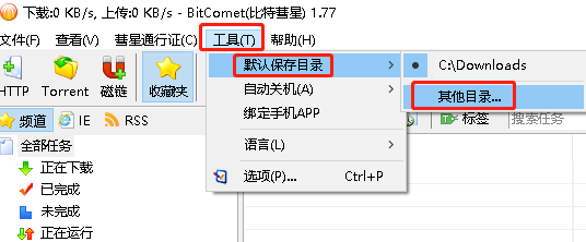 同样是在比特彗星主页面,点击页面上方的工具键,在弹出的选项中,选中默认保存目录一栏中的“其他目录”选项。之后在弹出的选择默认保存目录窗口,找到之前建立的文件夹,点击“选择文件夹”按钮就完成了。