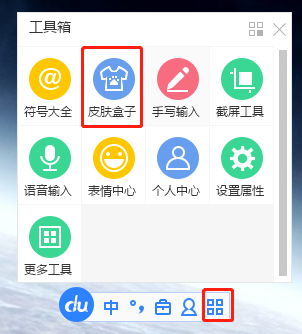 想要修改百度输入法皮肤的小伙伴,首先需要将电脑的输入法切换为百度输入法,再点击输入法状态栏中的百宝箱图标,在弹出的选项中,选择“皮肤盒子”选项。