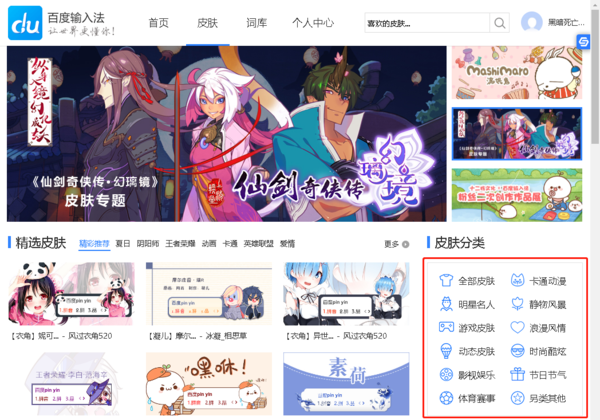 如果觉得皮肤盒子上的皮肤不好,也可以点击左下角的“查看更多精彩皮肤”字样。就能自动跳转到百度输入法网页版的皮肤中心,之后根据皮肤类别来查找添加就可以了。