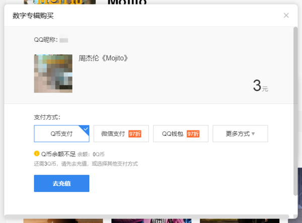 点击这首歌曲后,在弹出的提示框下方选择“立即购买”,选择支付方式,扫码支付即可完成购买,如果选择q币支付,则要先去充值才可以购买该歌曲。