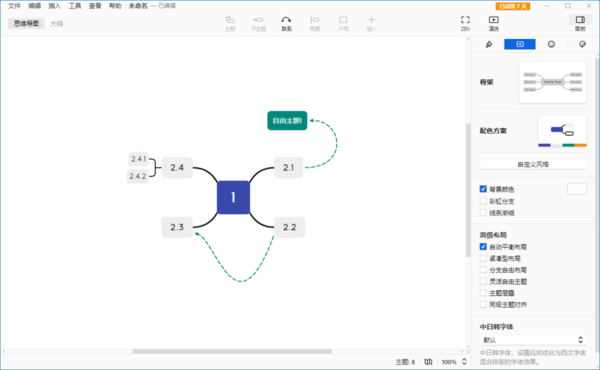 在选择好某一结构的导图后,我们就来到了导图编辑界面。就以思维导图为例,我们可以看到导图是由很多个主题连接而成,那么我们就需要知道:中间的蓝色的是总的主题,像蜘蛛腿一样往外延伸的是总主题的子主题。对此我们既可以在总主题下面建立子主题,也可以对子主题建立同级子主题和下一级子主题,让我们的逻辑形成鲜明的层次感。此外,说到主题,其实还有自由主题,但是它和主题之间的联系也有关,因此我们放到指南三去讲。