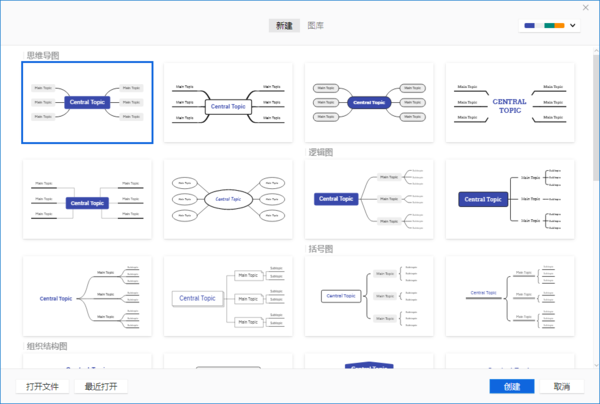 既然要用Xmind,首先就需要决定好使用哪种结构的导图,因为不同结构的导图,它的适用情况也不太一样。在我们打开Xmind的时候,就会提示我们选择导图结构,其中有思维导图、逻辑图、组织结构图、鱼骨图等结构,我们可以根据自己的实际需求进行选择。