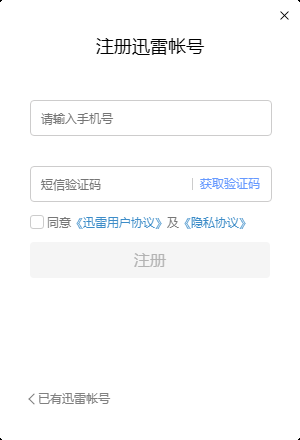 2、填写手机号,并接收验证码填到对应一栏中,点击同意《迅雷用户协议》及《隐私协议》前面的方框打勾,最后点击“注册”,即为注册成功。