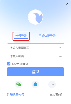方式一:点击位于迅雷影音播放界面左上方的“登录”按钮,在弹出的登录界面,选择“账号登录”,输入之前注册的迅雷账号以及密码,点击登录。