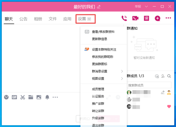 在QQ电脑版的群聊当中,群聊的设置包含很多内容,比如群消息设置、成员管理设置、视图设置,以及转让、升级、退出该群等设置。而想要找到QQ电脑版的群聊的设置,我们可以直接在QQ的群聊中,双击打开该群聊,然后进入到群聊的聊天窗口,在窗口的顶部,我们便可以看到【设置】选项,这里我们就可以设置QQ的群聊了。或者是直接点击【设置】选项,即可对群聊进行设置。
