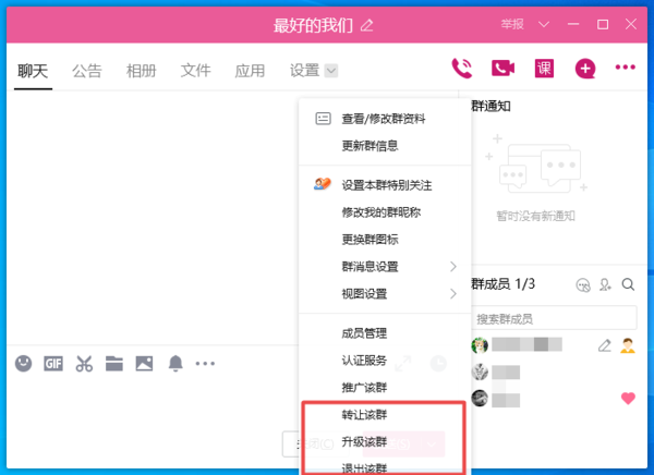 在QQ电脑版的群聊设置选项中,点击转让该群或退出该群,即可将自己管理的群聊转让给群聊内的好友,如果不想在该群聊中了,也可以退出该群聊。