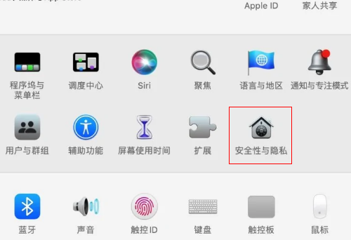 第二步:进入系统偏好设置界面,点击安全性与隐私进入。