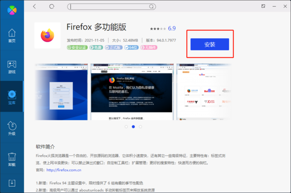 2.搜索内容出现后,点击页面第一个“Firefox多功能版64位专版”进入详情页面,点击右上方蓝色“安装”按钮进行下载。
