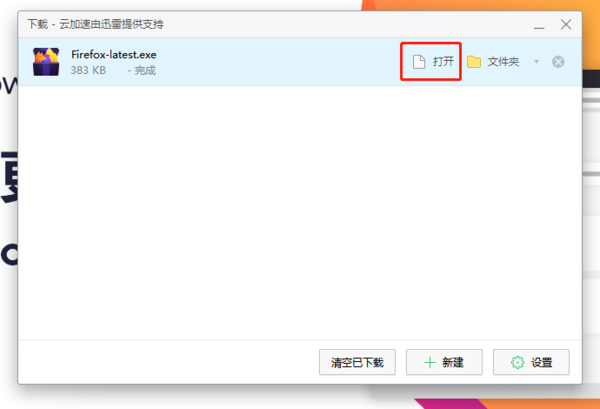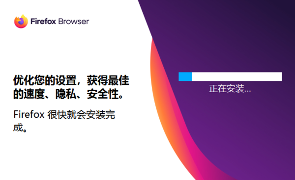 在Firefox火狐浏览器的安装程序下载完成后,点击“打开”按钮,弹出Firefox火狐浏览器安装程序界面,等待安装。