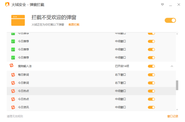 4.同时点击弹窗拦截窗口右下角的【窗口记录】选项,还可以查看火绒软件为我们查看的拦截的广告弹窗了。