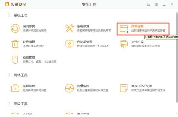 2.然后在安全工具界面中,找到【弹窗拦截】功能,并点击它。如果功能是首次使用的话,需要耐心等待功能安装完成。