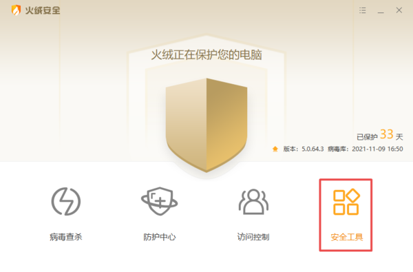 1.启动电脑上的火绒安全软件,进入到软件的主界面当中后,点击右下角的【安全工具】选项。