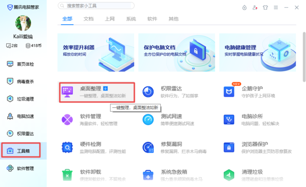 2.进入到工具箱界面当中后,我们找到【桌面整理】工具,并进行下载安装。如果在页面中找不到的话,也可以直接在界面顶部的搜索栏中搜索。