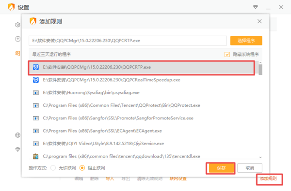 接着,选择想要控制禁止联网的程序,然后点击【保存】。