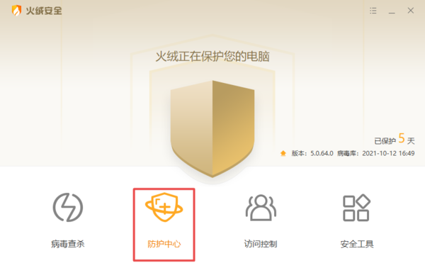 一、打开电脑上的火绒安全软件,进入到软件的主界面当中后,找到【防护中心】选项,并点击进入。