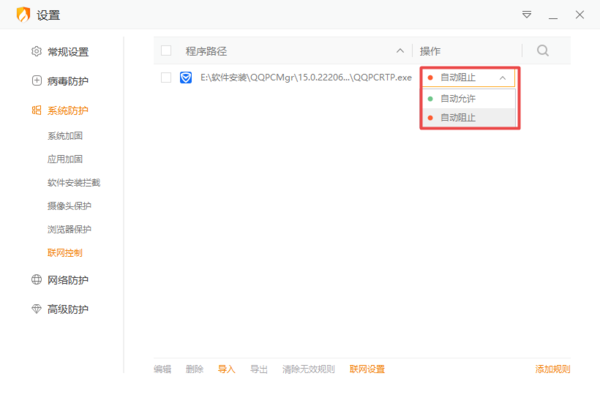 最后,我们将刚刚添加好的程序右侧的【操作】设置为【自动阻止】,便可以成功的阻止该软件联网了。