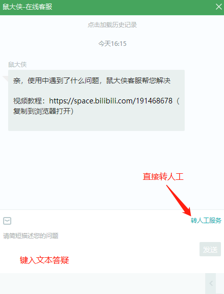 我们在客服界面的右下方,可以看到较小的几个字“转人工客服”,如果我们有需要,就去转人工,或许可以解决更多的问题,而且人工客服可以根据我们的问题,精准地进行解答,甚至可以给我们一些建议,以让我们更好地使用鼠大侠鼠标连点器。