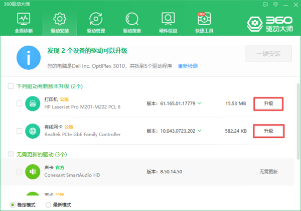 3.而如果软件检测到有可以更新升级的显卡驱动或其他驱动的话,就会在界面上显示出来。此时我们点击相关驱动右侧的【升级】选项即可。
