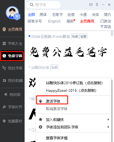 使用方法二:在iFonts字体助手上,将鼠标移至字体选项上方后,单击鼠标右键,在弹出选项中点击“激活字体”功能。字体激活完成后,在word等文件编辑软件上,打开字体选择就能找到对应的字体。