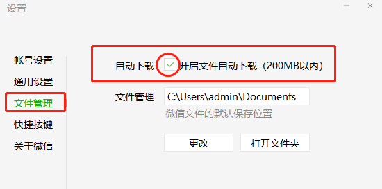 在文件管理页面不仅可以设置文件自动下载,微信文件的默认保存位置也是可以在这里更改的。在自动下载下方的文件管理处,我们可以看到微信文件的默认保存位置在哪里,点击下方的【打开文件夹】可以直接到达目标文件或者点击下方的【更改】还能重新选择微信文件的默认保存位置。