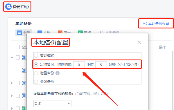 第四步:在本地备份配置界面,有多种备份模式可以选择,小编这里选择的是“定时备份”,定时备份时间间隔是可以调节的,这里设置为“5分钟”备份一次。