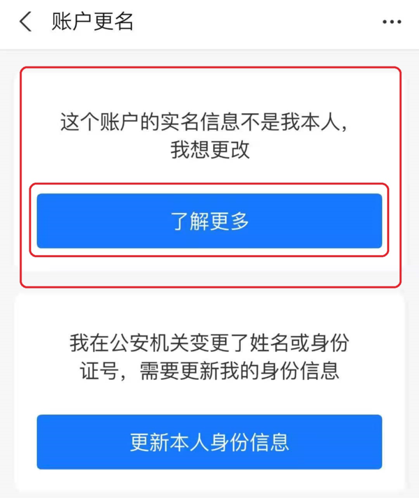 第六步,然后我们在弹出的账户更名界面中,可以看到两个按钮,点击这个账户的实名信息不是我本人,我想更改下方的【了解更多】按钮。此时我们会看到,我们是无法进行账户的实名认证的修改的。