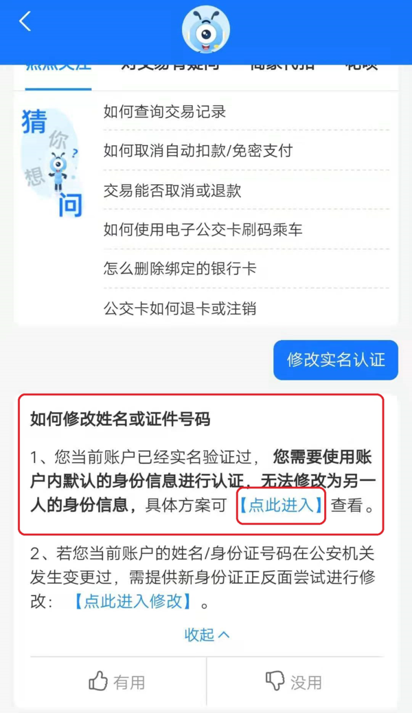 第五步,然后在界面中就会弹出【如何修改姓名或证件号码】的回复消息了,此时我们就可以找到,当前已经认证过的支付宝账号,是无法修改为另一个人的身份信息的。我们可以点击具体方案可【点击进入】查看中的【点击进入】按钮来进行查看。