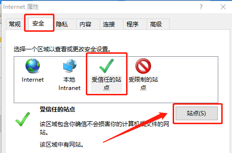 第四步:在出现的Internet属性界面,点击安全,选择“受信任的站点”选项,再单击“站点”键。
