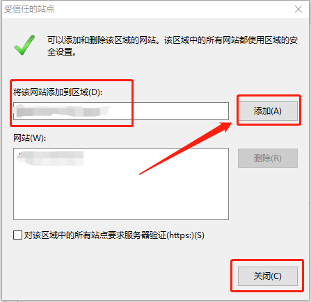第五步:在弹出的受信任站点界面,输入网站地址,单击“添加”之后,再选择关闭就添加完成了。
