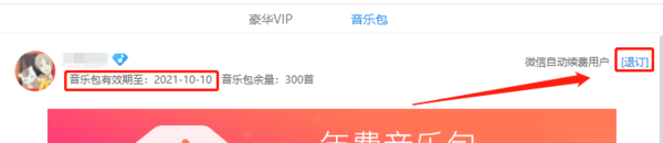 第二步:打开后就可以看到音乐包的使用期限,右上角有一项提示“微信自动续费用户”,点击边上的“退订”键。