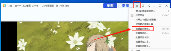 第二步:点击右上角的主菜单选项,在下拉窗口中点击“批量图片转换”选项。