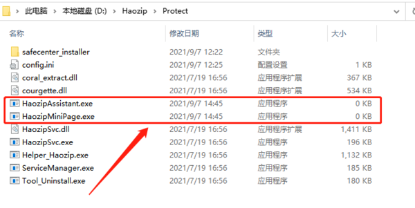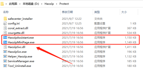 第三步:在文件内找到“HaozipAssistant.exe”和“HaozipMiniPage.exe”这两个文件并删除。