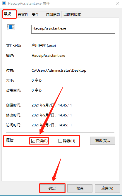 第五步:选择新建的两个文件,右键选择“属性”,在“常规”设置中,将属性设置为“只读”,点击“确定”。