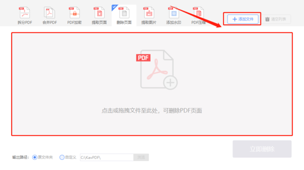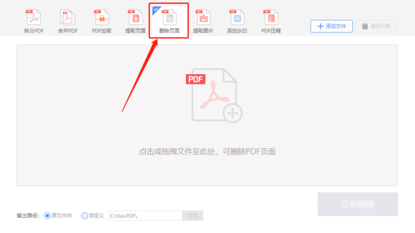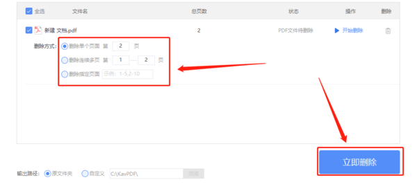 第五步:文件打开后,选择删除方式和指定页码,如:删除单个页面?第2页。也可选择删除后的文件输出路径,如不需要修改,可直接点击“立即删除”。