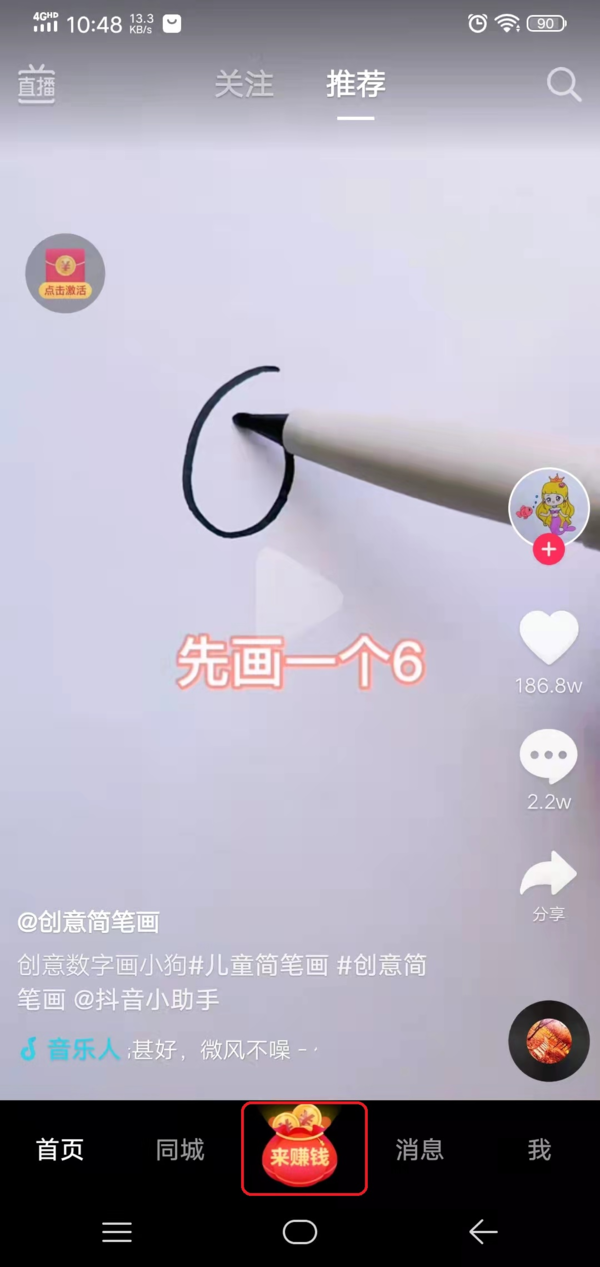 第一步,打开抖音极速版软件,进入到软件的主界面当中后,我们找到界面底部中间的红色袋子图标,并点击它。
