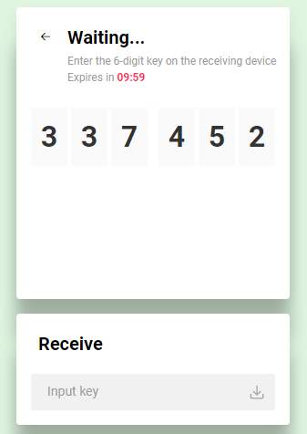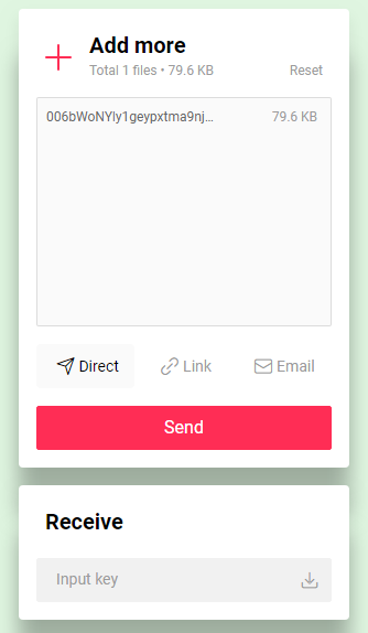 添加好需要传输的文件后,可以选择通过密码分享、链接分享和邮件分享三种方式,点击Send即可完成文件的上传。使用密码分享上传的文件会在云端服务器保留10分钟,将系统提供的6位密码输入到下方的Receive区域即可下载文件。