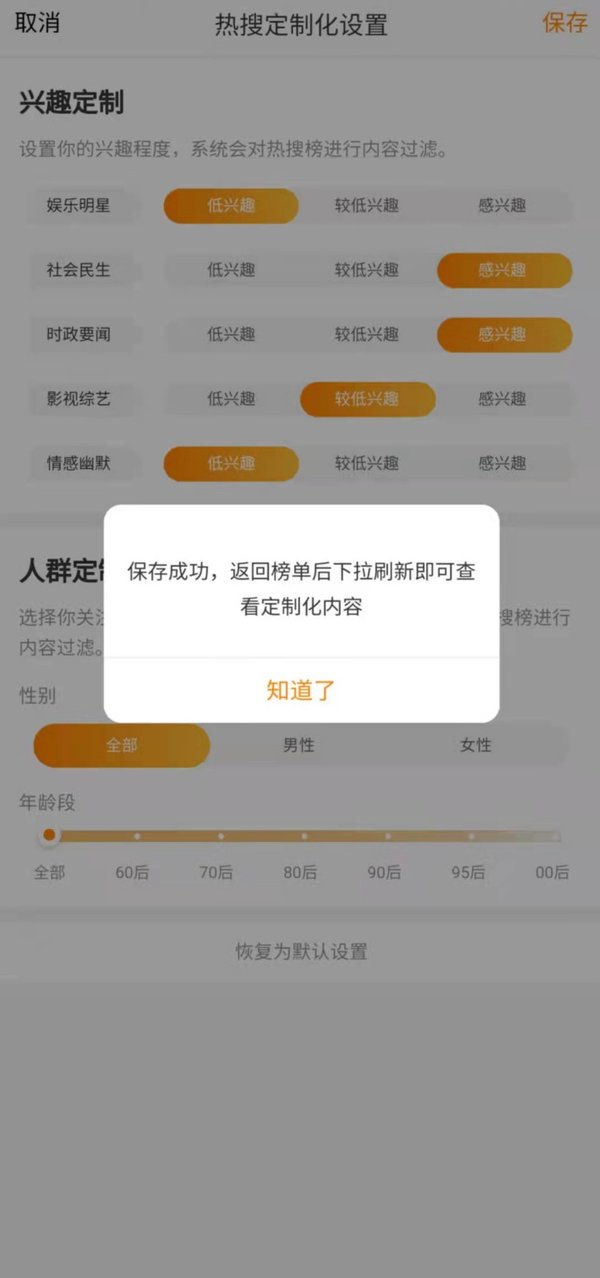 成功保存后,返回微博热搜榜单页面,下拉刷新后即可查看定制化内容。