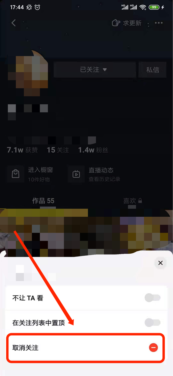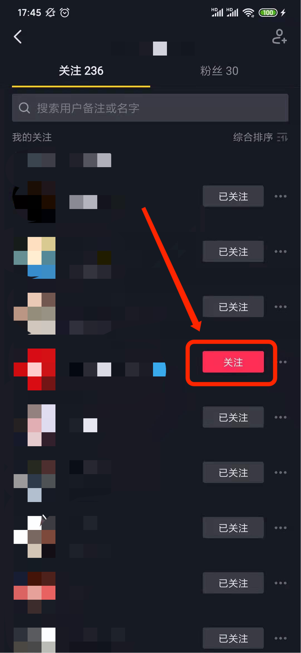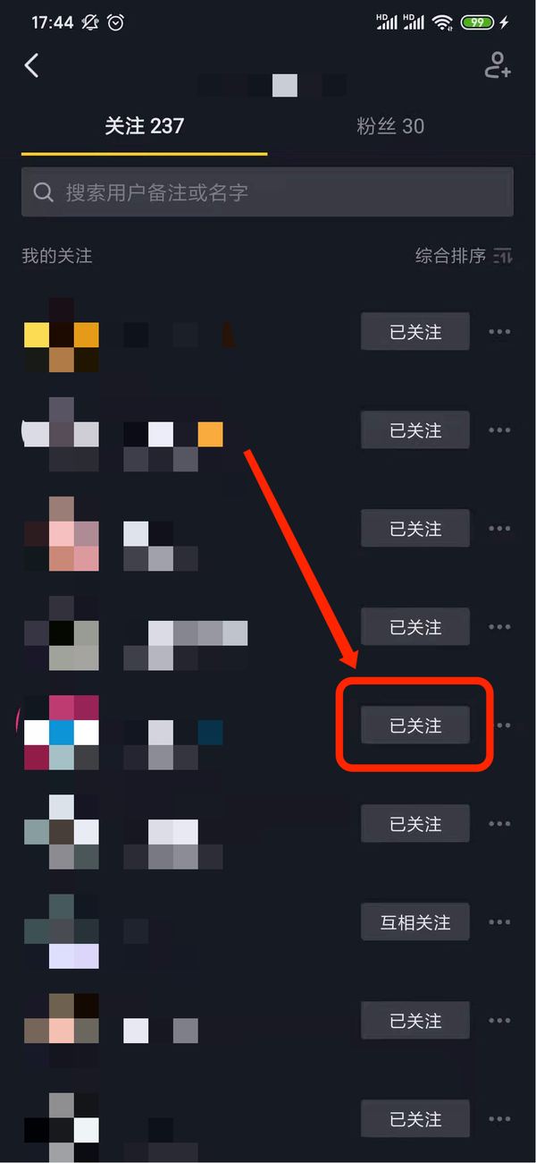 方法二:点开抖音右下角【我】,再打开关注列表,在这里可以看到已关注的所有人,找到想要取关的那个人点击右侧的【已关注】就能取消对他的关注了。