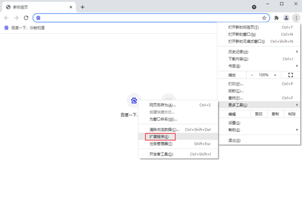 首先打开谷歌浏览器,点击右上角的菜单,选择更多工具——扩展程序。