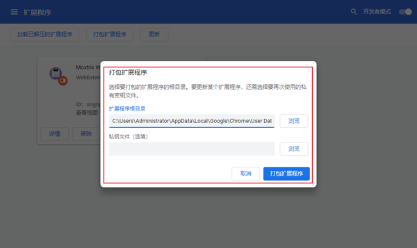 在C:\Users\Administrator\AppData\Local\Google\Chrome\User?Data\Default\Extensions文件夹中找到需要备份的插件,将路径复制到扩展程序根目录,点击打包扩展程序。