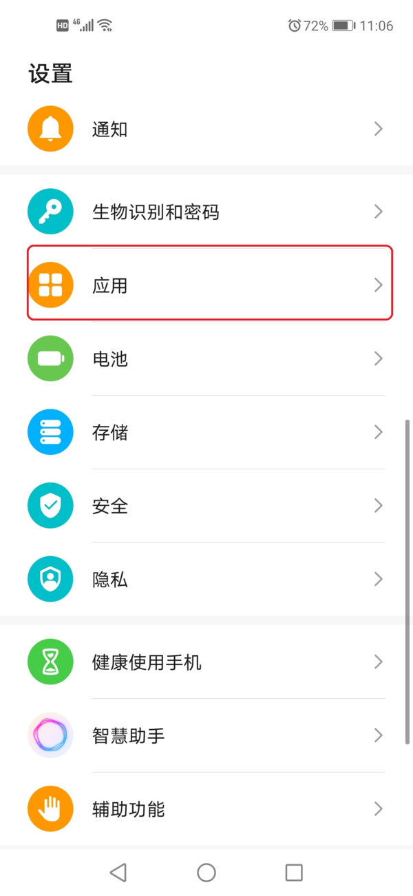 第一步,首先我们需要在手机上安装一个美颜相机应用,最好是自己习惯使用的。然后在打开手机的设置界面,找到【应用】选项,并点击进入。