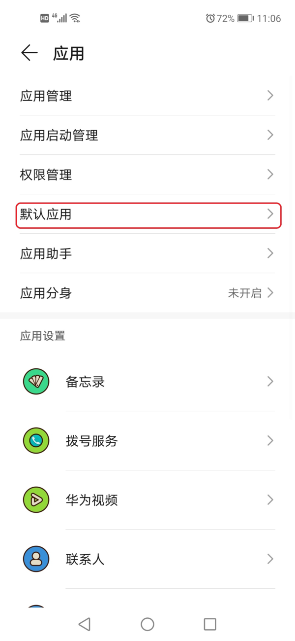 第二步,进入到手机的应用界面当中后,找到【默认应用】选项,并点击进入。