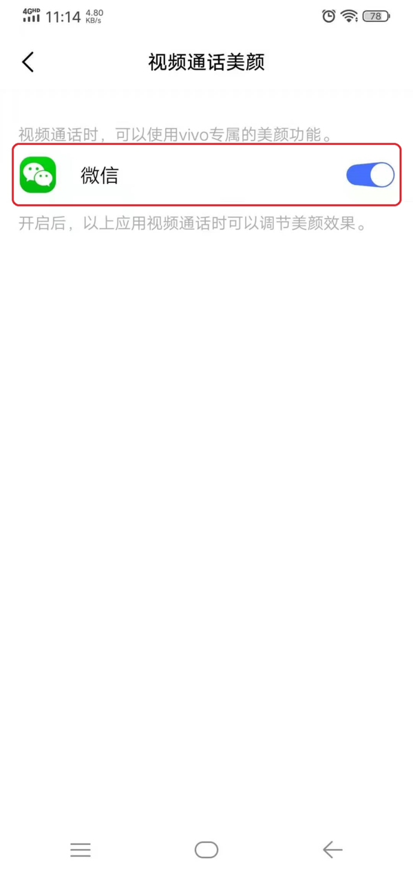 第三步,进入到手机的视频通话美颜设置界面当中后,此时如果可以开启微信的视频聊天美颜功能的话,那么微信应用就会出现在该界面当中,此时我们将微信右侧的开关滑动打开。