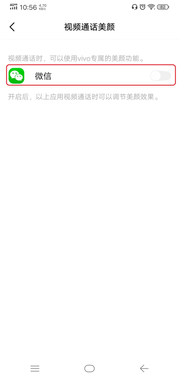 如果想要微信视频聊天时开启美颜功能的话,就需要我们的手机自带美颜功能,才可以使用这个功能,否则的话也是无法使用的。下面以vivo手机的设置方法为例进行介绍,具体的设置方法如下: